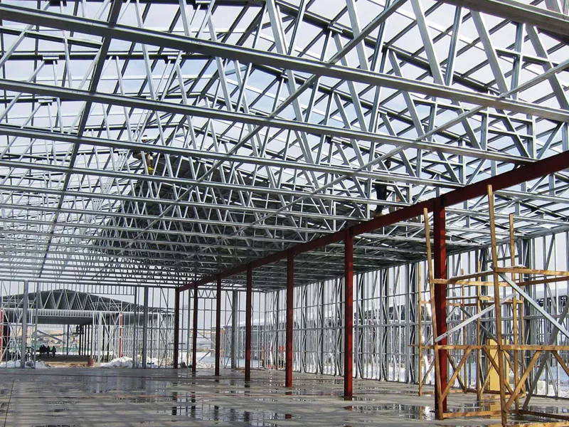 Nuair a bhíonn an fráma cruach críochnaithe, tá an córas dín suiteáilte, ina bhfuil painéil miotail inslithe nó ábhair membrane aon-phly de ghnáth. Tá ballaí seachtracha, má tá siad san áireamh sa dearadh, suiteáilte freisin ag baint úsáide as painéil mhiotail, bríce, nó ábhair cumhdaithe eile. Soláthraíonn na heilimintí seo friotaíocht aimsire agus cuireann siad le hachomharc aeistéitiúil an fhoirgnimh.